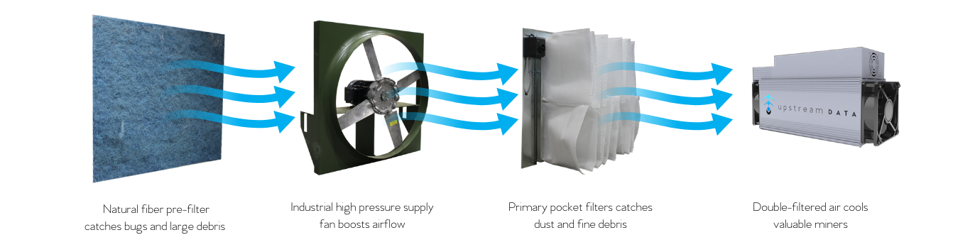 Unlike exhaust fans which draw a vacuum, our supply fans push positive pressure into the cold aisle which not only improves overall cooling, but prevents moisture leaks from small gaps anywhere in the mining enclosure.